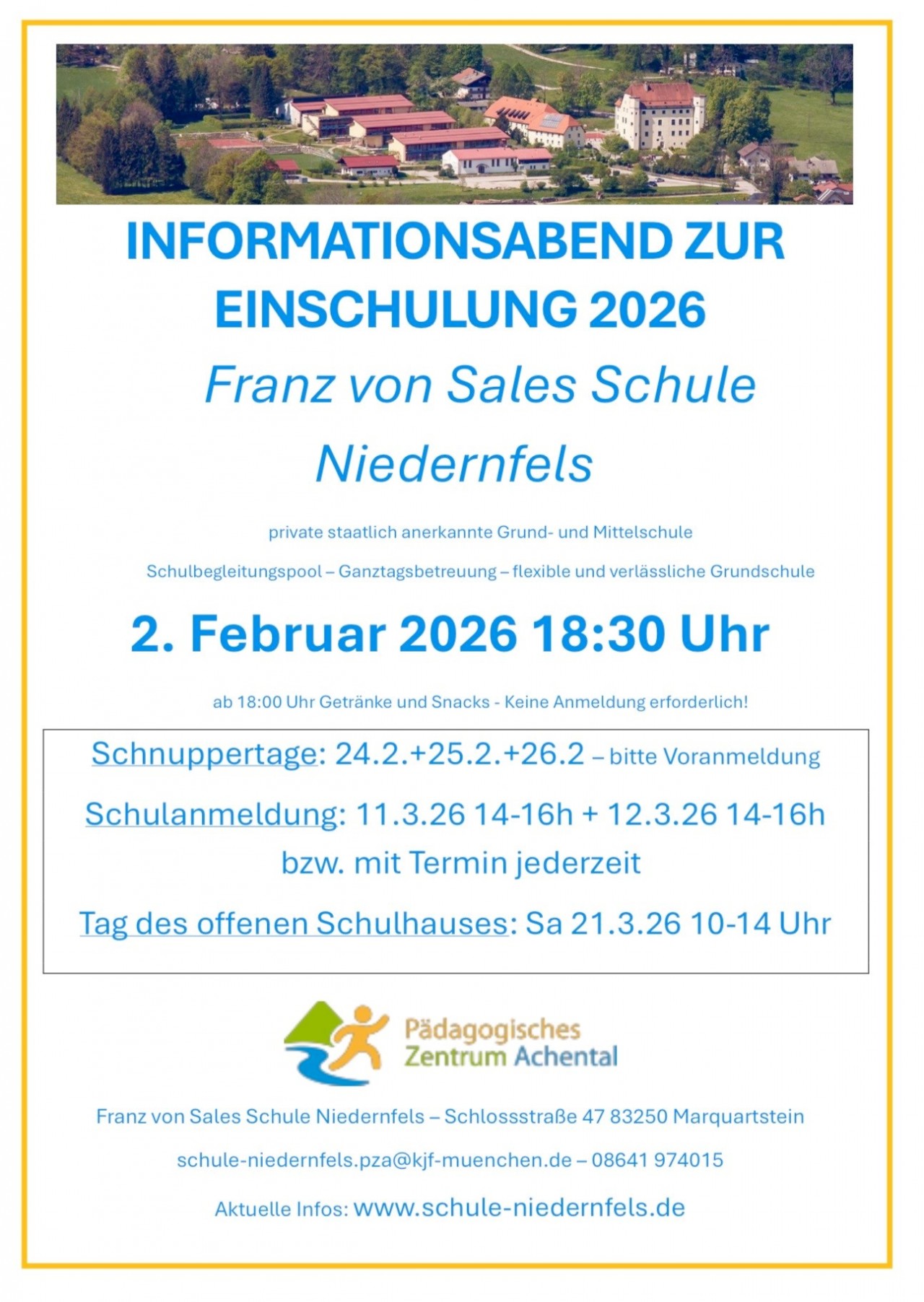 Am 2. Februar 2026 lädt die Franz von Sales Schule Niedernfels zu einem Informationsabend rund um die Einschulung 2026 ein. Ab 18:30 Uhr erhalten interessierte Eltern und Erziehungsberechtigte einen umfassenden Einblick in das pädagogische Konzept der privaten, staatlich anerkannten Grund- und Mittelschule. Bereits ab 18:00 Uhr ist bei Getränken und Snacks Raum für erste Gespräche - eine Anmeldung ist nicht erforderlich.